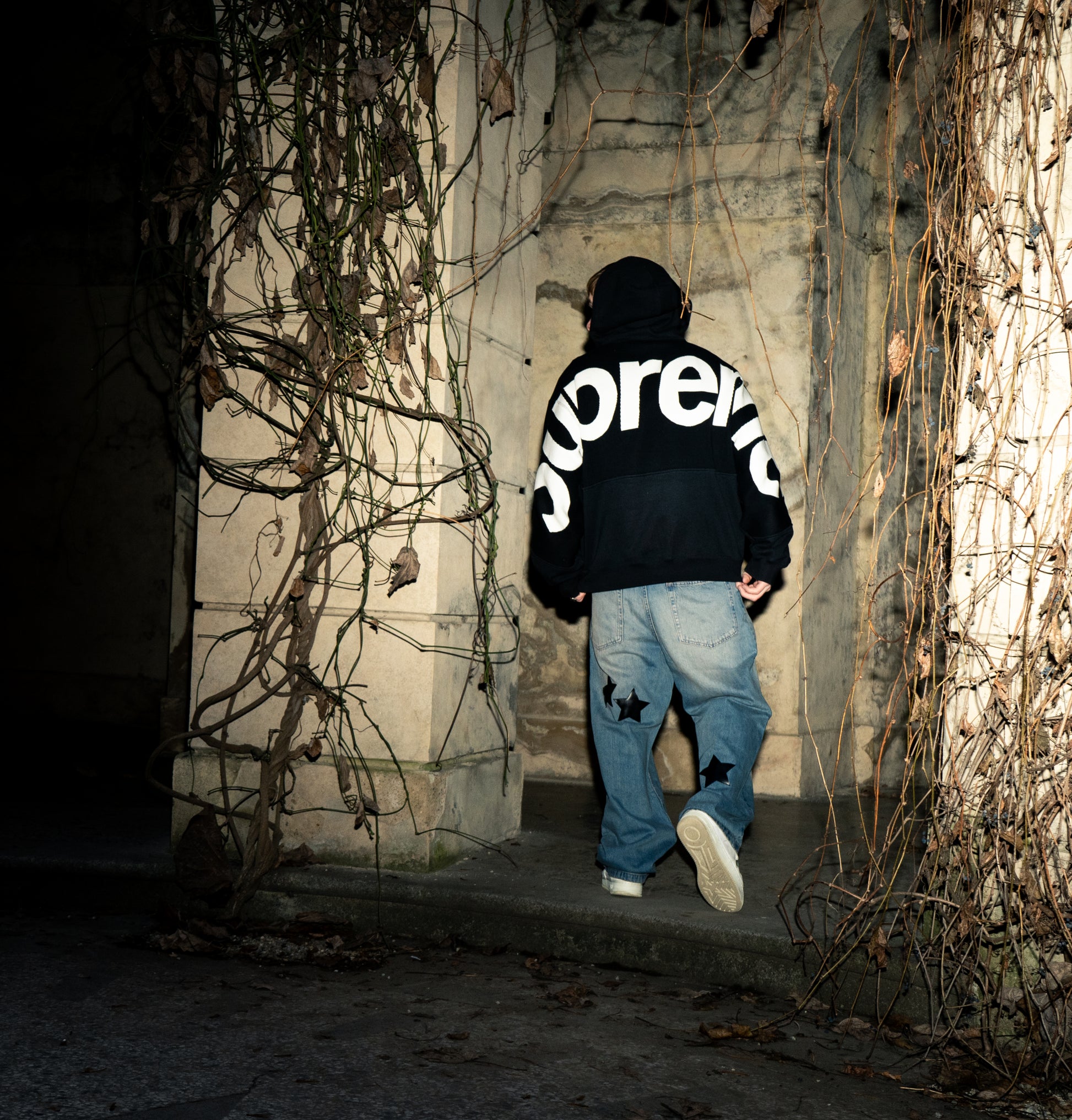 Tyto baggy modré jeans spojují pohodlný střih s originálním designem. Kožené hvězdy jsou pečlivě našité ručně, každý kus je unikátní a vznikl přímo v Praze.
